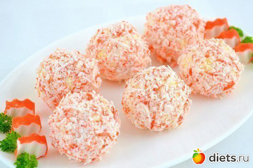 6. Выложить готовые шарики на тарелку, по желанию украсить порезанной крабовой палочкой и зеленью.