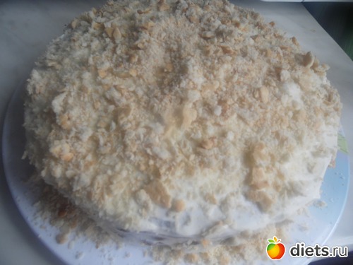 Укладывать слоями, каждый слой смазать сметаной взбитой с сахаром, посыпать орешками, переложить фруктами. Верхний слой украсить по желанию