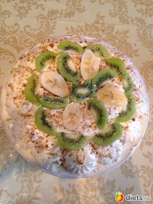 Укладывать слоями, каждый слой смазать сметаной взбитой с сахаром, посыпать орешками, переложить фруктами. Верхний слой украсить по желанию