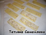 На каждую полоску выкладываем начинку и сворачиваем розочкой. Каждая розочка состоит из трех полосок (один ломтик).