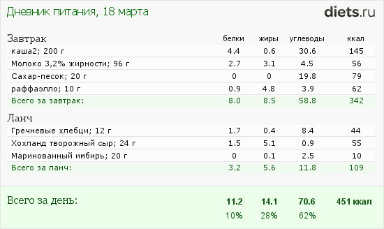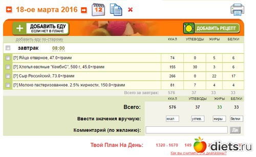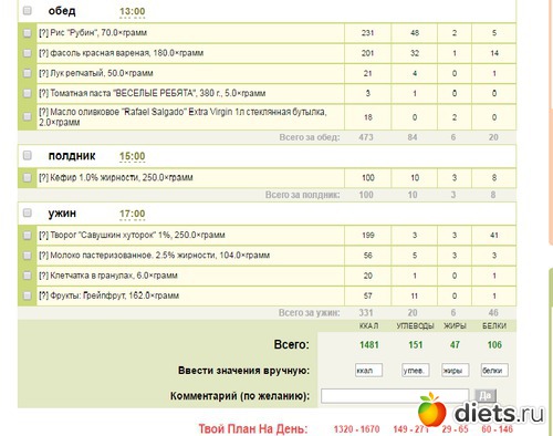 Нет, я на другом сайте, диета-он-лайн, мне там удобнее, БЖУ виднее и база "любимых продуктов" своя забита. Сегодня вот как раз решила продукты на завтрак взвесить, могу и остальное позаписывать, так что к концу дня и скрин будет