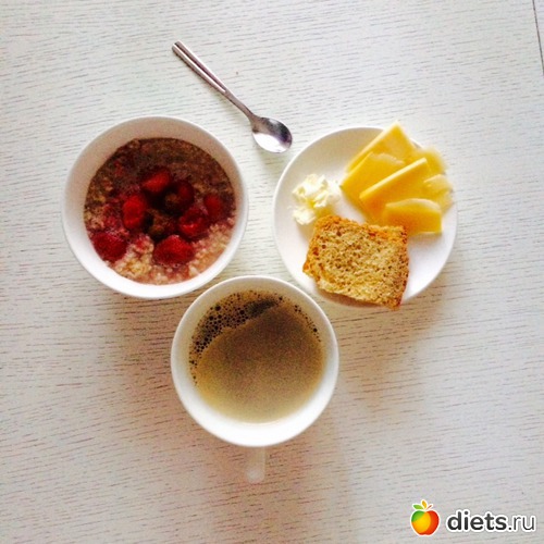 Завтрак: кофе, овсянка с замороженной клубникой и рисовым молоком, сыр Маасдам, цельнозерновой хлеб, масло сливочное, кофе