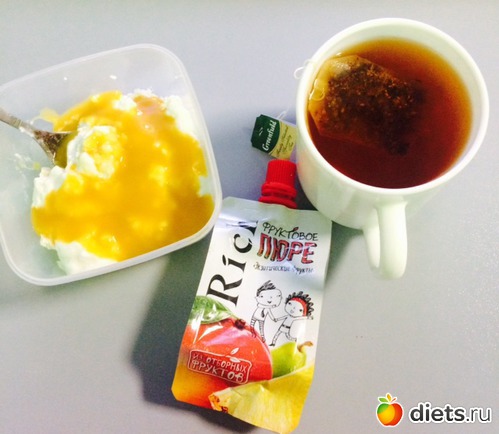 Ланч: творог обезжиренный, фруктовое пюре, чай ройбуш
