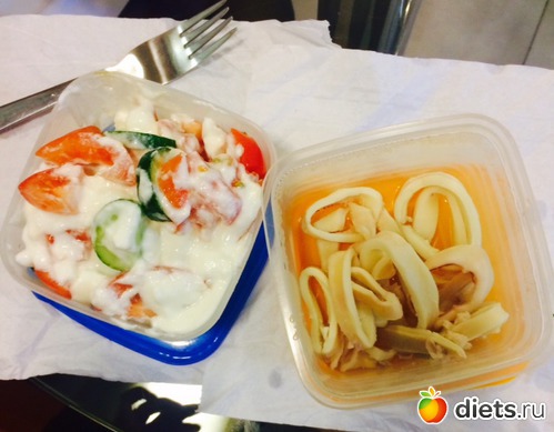 Обед: салат из огурцов и помидоров с йогуртом, кальмары отварные... Читать полностью