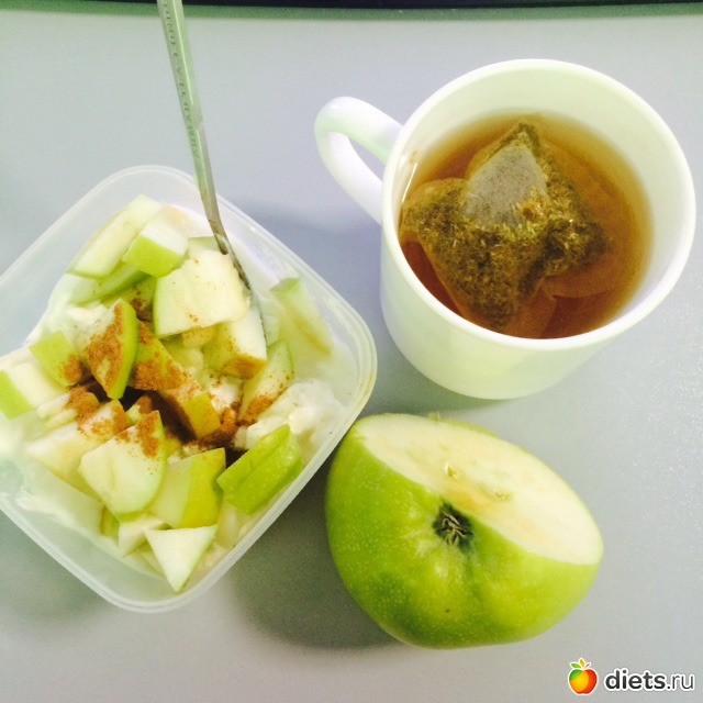 Полдник: творог обезжиренный с яблоком и корицей, ромашковый чай
