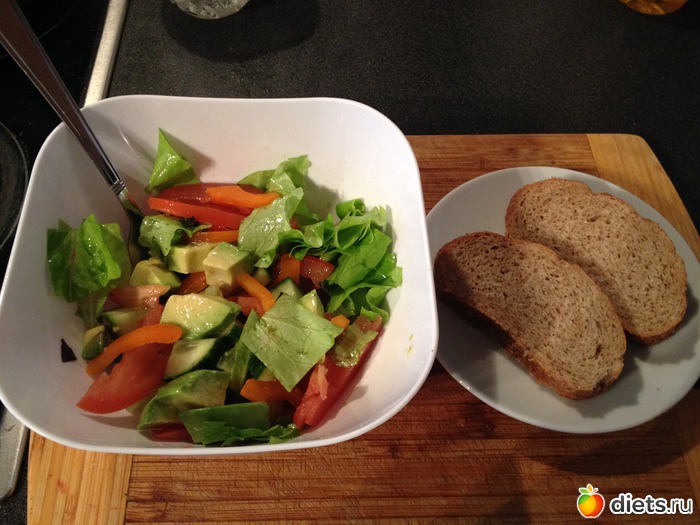 Завтракала свежим салатом с ароматным маслом и вкусным гречневым хлебом.