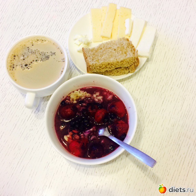 Завтрак: Перловая каша с черникой, клубникой и рисовым молоком, цельнозерновой хлеб, сыр, сливочное масло, кофе