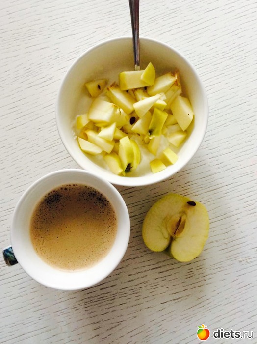 Ланч: творог обезжиренный, кефир, яблоко, кофе