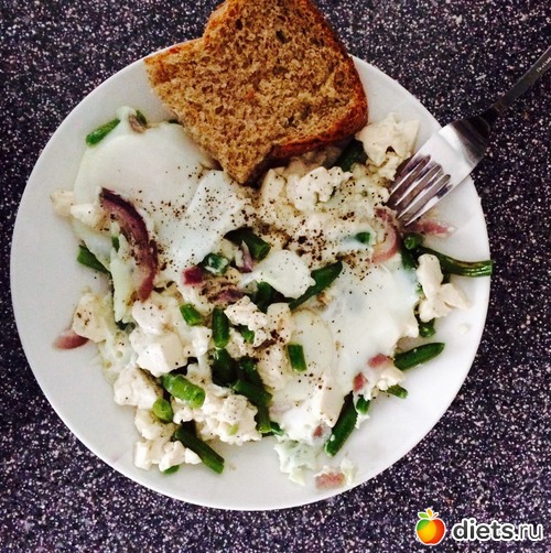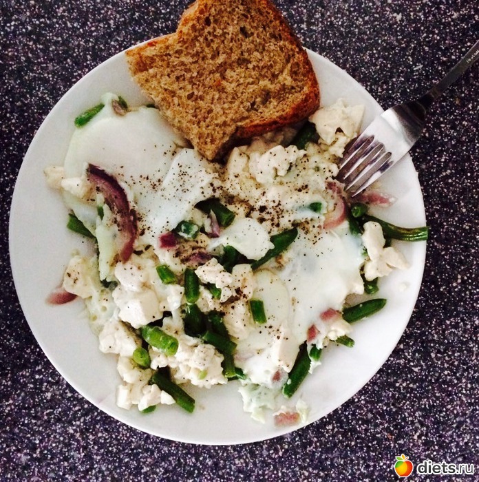 Обед: омлет из яиц, тофу, лука и зеленой фасоли, цельнозерновой хлеб