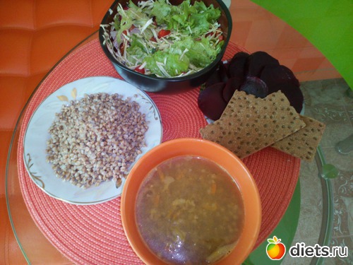 Запареная гречка. Овощной бульон (кинула и туда гречку). Отварная свекла, 2 ржаных хлебца.