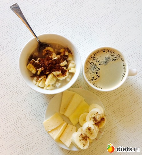 Завтрак: перловая каша с рисовым молоком, бананом и какао, сыр, кофе