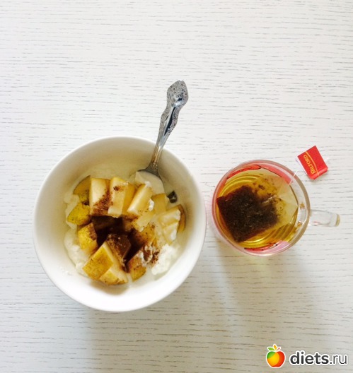 Ланч: творог обезжиренный, груша, корица, чай ромашковый (еще были два сырника без сахара, но я спешила на тренировку и поэтому без фото :-( )