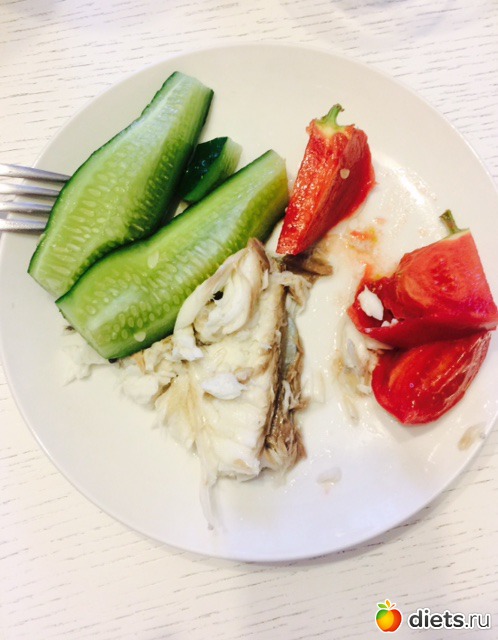 Обед: дорадо запеченная, огурец, помидор