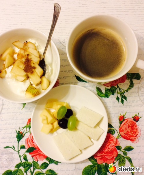 творог обезжиренный, груша, корица, сыр, немного винограда и кофе
