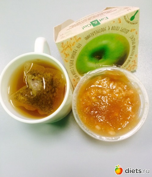 Ланч: ромашковый чай, десерт из яблок и овсянки (купила на пробу, удовольствия особого не получила...простое яблочко и дешевле и вкуснее)