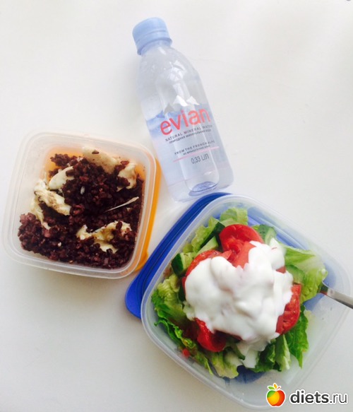 Обед: салат из помидоров, огурцов, салата, заправленный йогуртом (как Вы понимаете, моя вышеупомянутая коллега притащила сегодня огурец, помидор и йогурт..), черный рис, дорадо запеченная