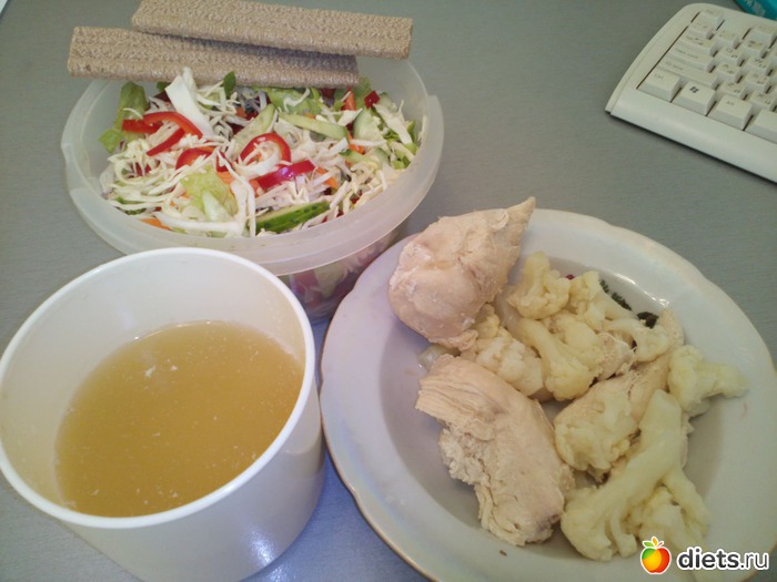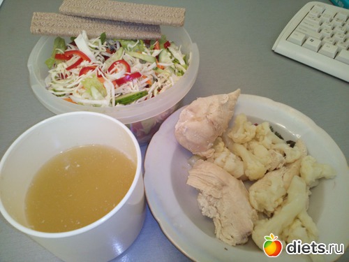 О. Отварная курогрудь, отварная цветная капустка, бульон от них и свежий салатик. Слата ем много в каждый прием пищи.