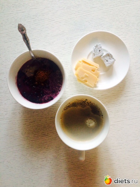 Завтрак: овсянка с черникой и рисовым молоком, сыр, одна мятная зефирка, кофе