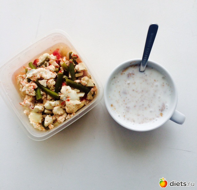 Обед: мой уже почти фирменный "омлет" с тофу, стручковой фасолью, луком и помидором, кефир с клетчаткой и корицей