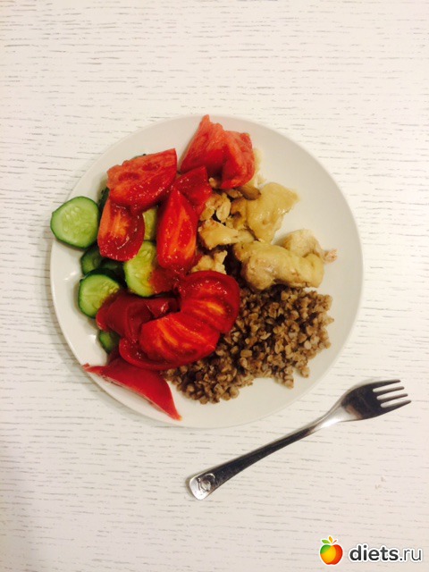 Ужин: гречка, куриное мясо запеченное, помидор, огурец
