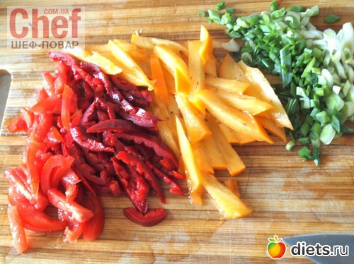 Соломкой нарезать хурму, перец и помидоры, измельчить зелёный лук.