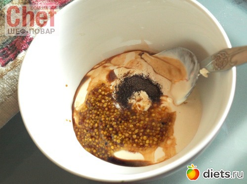 Для заправки смешать сметану с горчицей и соевым соусом. Добавить молотый перец.