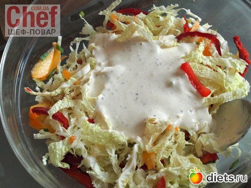 Соединить заправку с салатом, перемешать. Если потребуется добавить соль.