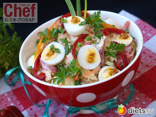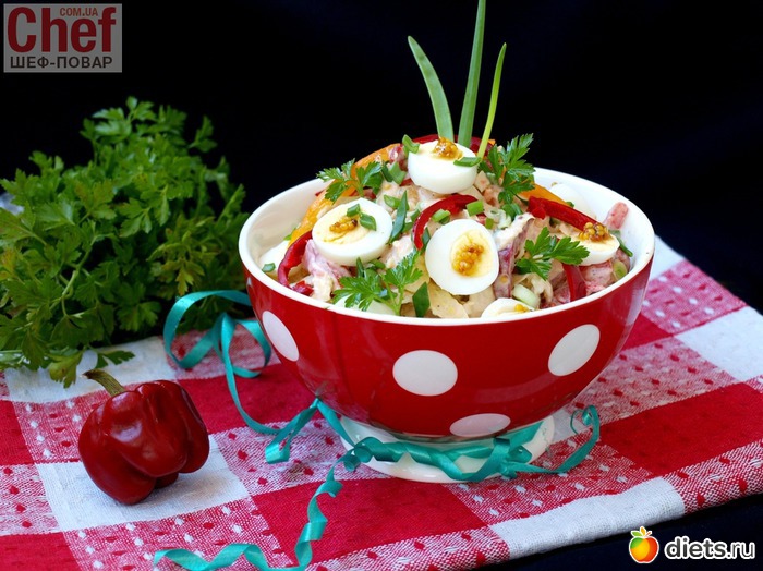 Выложить салат в красивый салатник, украсить кусочками перца и хурмы, разложить разрезанные пополам перепелиные яйца.