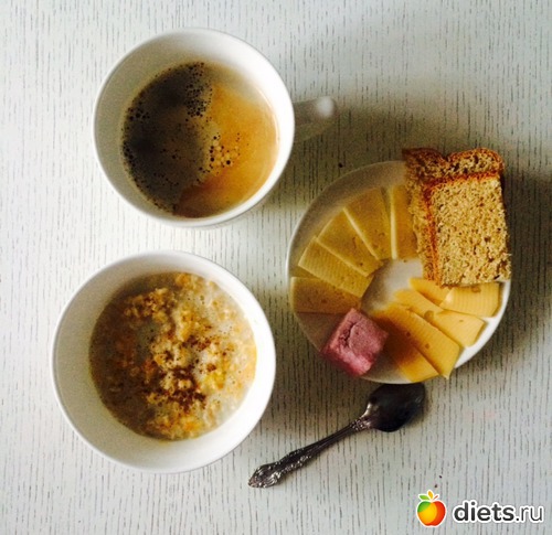 Завтрак: овсяная каша с тыквой, соевым молоком и корицей, цельнозерновой хлеб, сыр, клубничная зефирка, кофе
