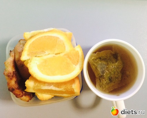 Ланч: ромашковый чай, апельсин, 2 сырника-плюшки домашних (цельнозерновая мука, банан, яйцо, творог и в духовку)