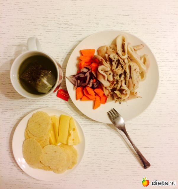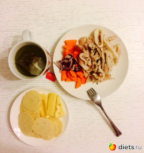 Ужин: морковь, лук, кальмары, сыр, хлебцы, чай ромашковый