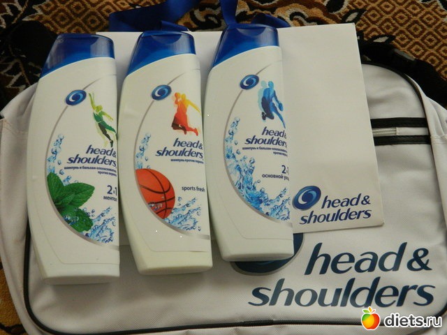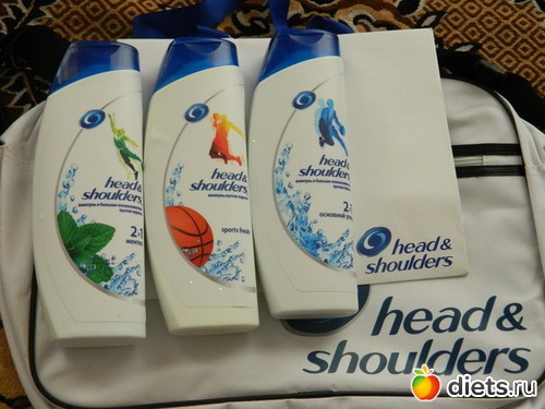 В коробке лежала спортивная сумка с логотипом Head&Shoulders, три шампуня для мужчин и брендированный пакет.