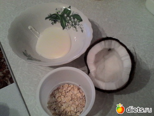 это для маски. Натерла кокос на терке, и залила горячей водой и поставила охлаждаться. Овсяные хлопья и сметану смешала в чаше.