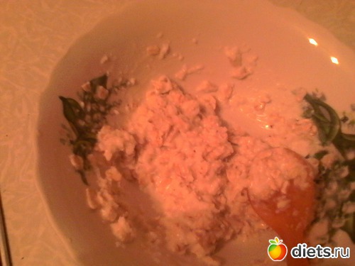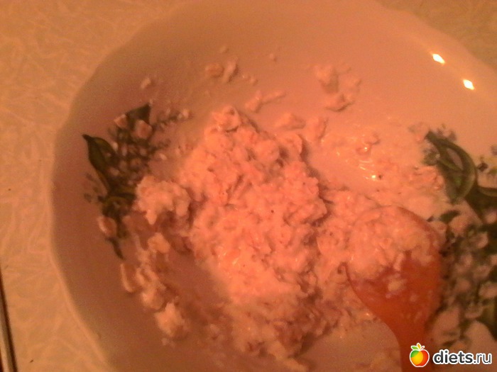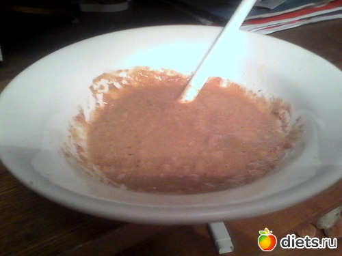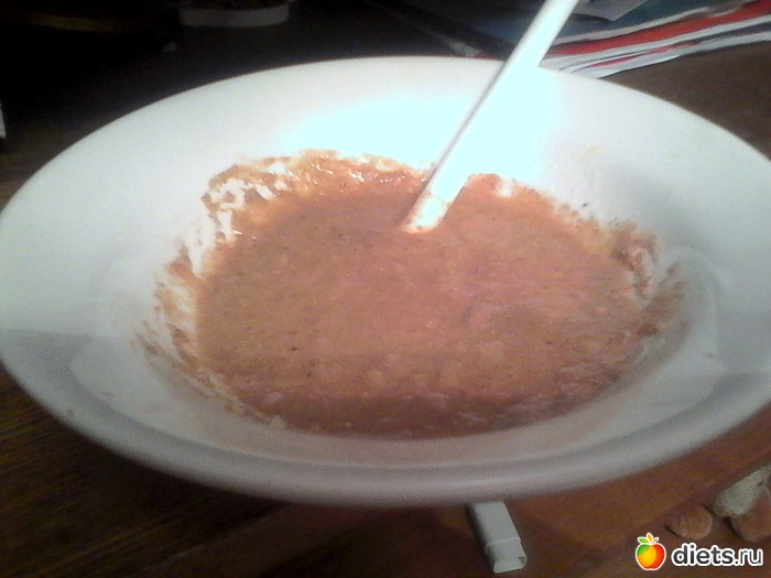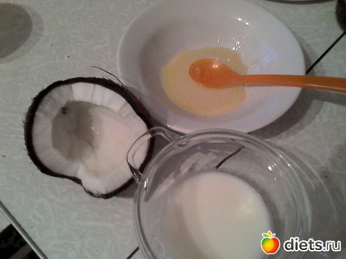 кокос ещё охлаждался, то я смешала мёд и кефир, когда мякоть была готова, то я добавила её. Мне показалось, что смесь жидкая и я добавила немного гречневой муки.