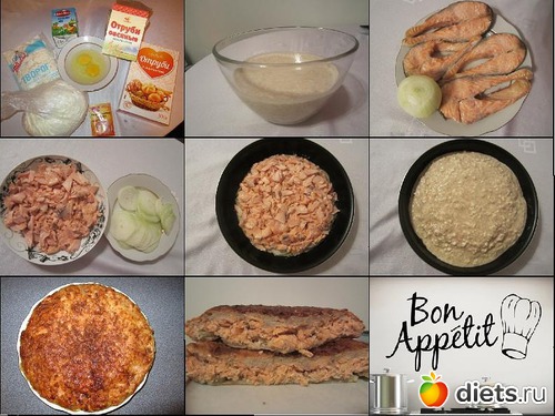 Одну треть теста налить в форму и запечь при той же темп. пока не образуется коржик. Сверху на него выложить лук, на лук - рыбу. Залить оставшимся тестом и выпекать 50-60 минут.