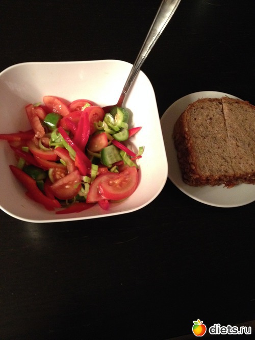 Ужин - свежий салат, заправленный ароматным маслом с вкусным зерновым хлебом. Ням!