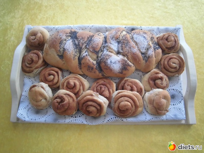 Вот что получилось! По счёту около 45 пирожков с мясом и капустой (первый противень дети умяли с пылу с жару, пирожки размером почти с мою ладошку), плюс булочки с корицей (13шт) и плетёнка с маком (была сделана уже на последнем дыхании). Рецепт теста в конце, единственное изменение с моей стороны, я добавила 6 яиц вместо 8 для двойной порции, ещё, думаю, можно сократить кол-во сахара, сладковатое тесто для пирожков с солёной начинкой.