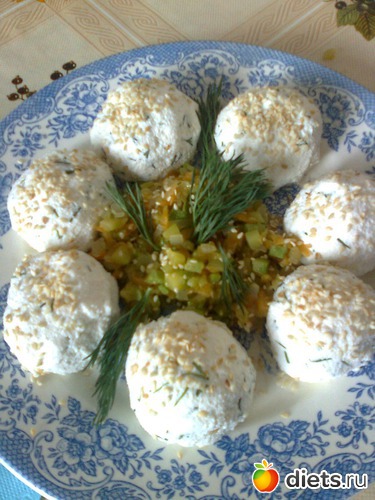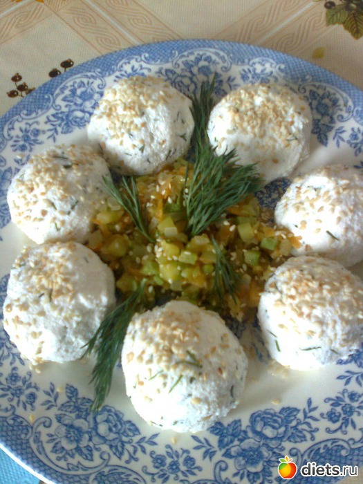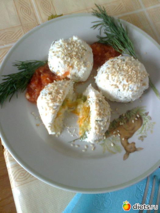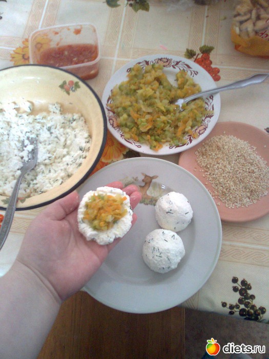 Раскатать лепешечки с творога выложить в серединку овощную смесь., скатать шарики. Шарики выложить на блюдо посыпать кунжутом (его лучше обжарить на сухой сковороде) украсить зеленью и остатками овощей))))