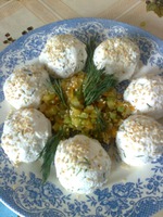 Творог перетереть с зеленью добавить соль, перец(творог должен быть не сухой). Овощи потушить с половинкой стакана воды(даже немного меньше) в конце добавить масло слив., остудить. Потом я разделила творог на равные части у меня получилось 10 комочков.