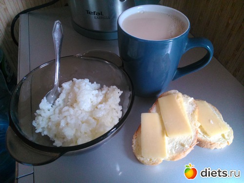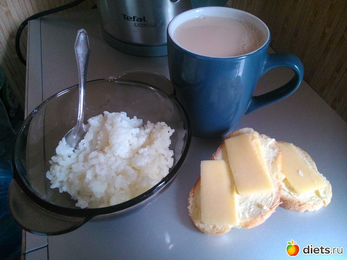 Завтрак - рисовая каша 3 ст. л., 2 бутерброда с сыром, чай с молоком без сахара.