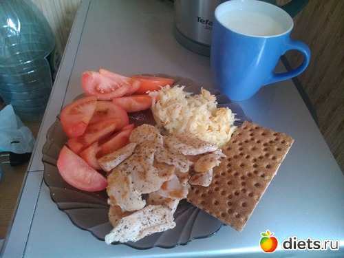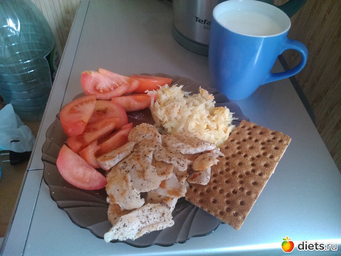 Обед - куриная грудка обжаренная на сухой сковороде, тушеная капуста, помидор, хлебец, стакан молока.