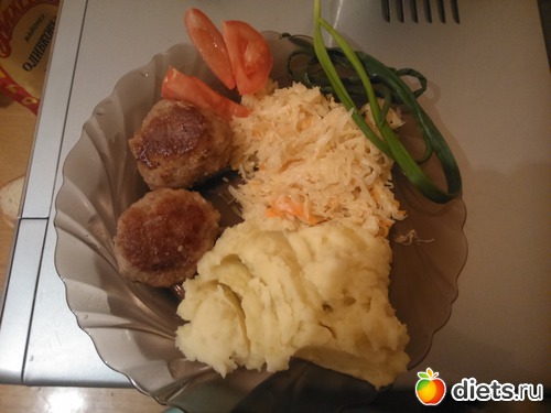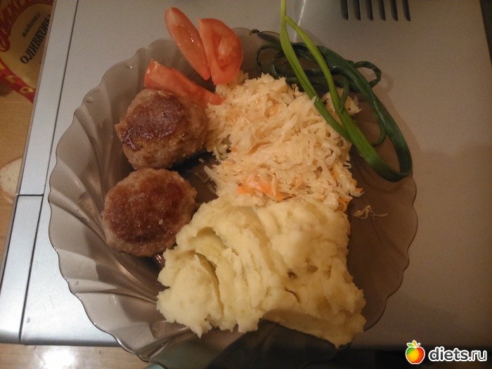 Ужин - две маленькие говяжьи котлетки, 2 ложки пюре, 2 тушеной капусты, пол помидора, перышко зелёного лука...