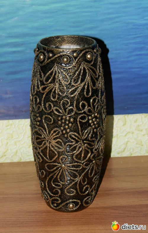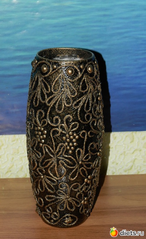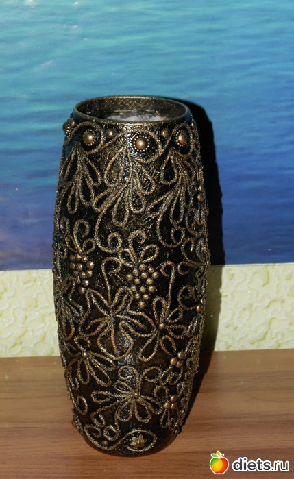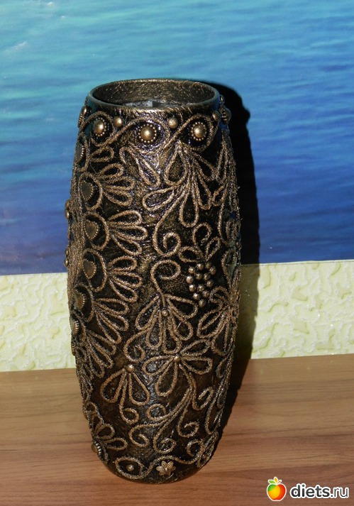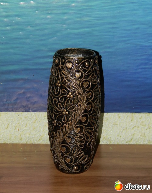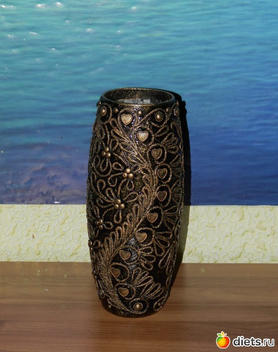 Ваза "Золотое плетение на чёрном" Очень красивая стеклянная ваза с отделкой ручной работы (единственный экземпляр) в стиле ПЕЙП-АРТ. Ваза выполнена под старинный стиль - золото на чёрном.
