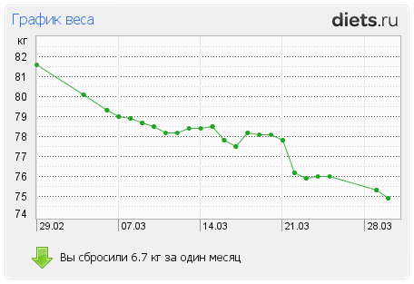 А тут, сделала график и оболдела, в марте я сидела на Магги, 15 дней, потом нарушила тем, что был разгруз на воде (из-за зубного ничего не ела) затем снова Магги, и уже 3 неделя и 2 день. За всю Магги я скинула 6,7 не знаю, кому это нормально, кому это мало, а мне так вообще класс...