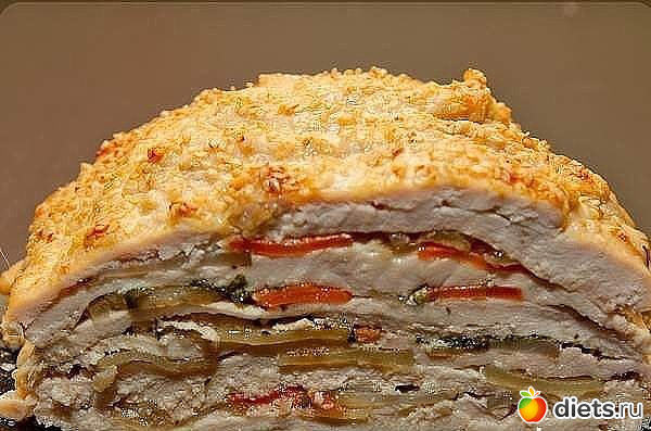 Можно делать порционно - одна куриная грудка на порцию, но мне кажется, что вкуснее и сочнее получается, когда всё готовится одним большим слоёным куском.