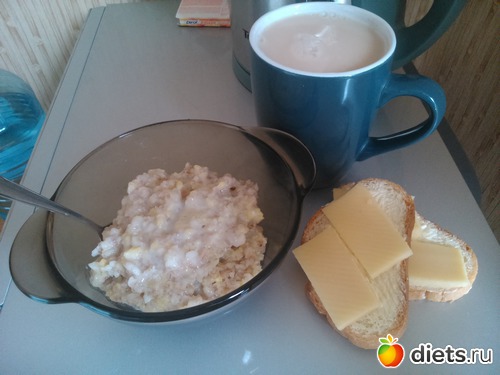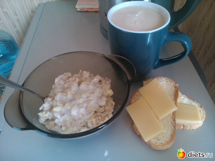 Завтрак - каша 5 злаков, 2 бутерброда с сыром, чай без сахара с молоком...