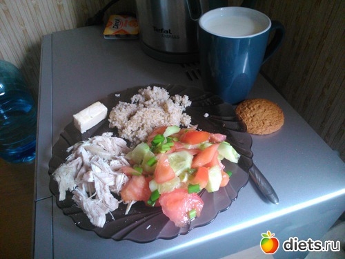 Обед - вареная грудка, ячневая каша, салат из помидор и огурцов, кусочек плавленного сыра, молоко, овсяная печенька.