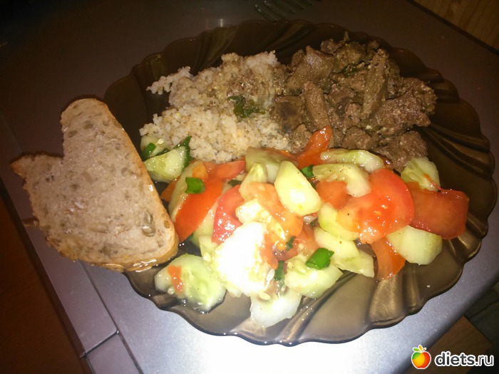 Ужин - печень туженая в йогурта, ячневая каша, салат, кусочек хлеба с семечками, чай с молоком...
