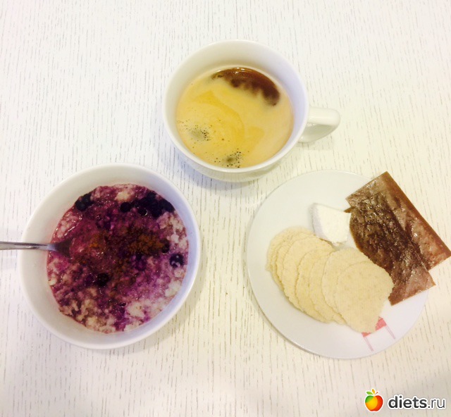 Завтрак: льняное масло, ячневая каша с черникой, миндальным молоком и какао, ржано-отрубные хлебцы, фету, пастилка с яблоком и корицей, кофе