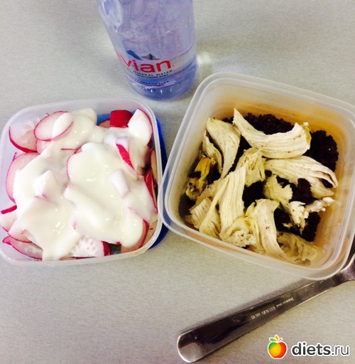 Обед: черный рис, запеченная куриная грудка, огурцы (спрятались, но они есть), редис, йогурт 1,5 %